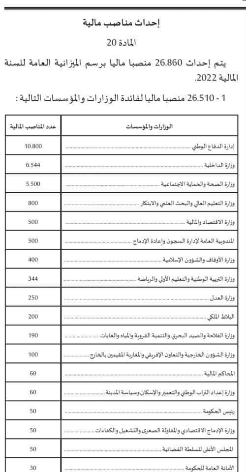 وتم إحداث 500 منصب لكل من وزارة الاقتصاد والمالية والمندوبية العامة لإدارة السجون، فما خصص 400 منصب لوزارة الأوقاف والشؤون الإسلامية، وتخصيص 250 منصب شغل لوزارة العدل، و200 منصب شغل للبلاط الملكي.