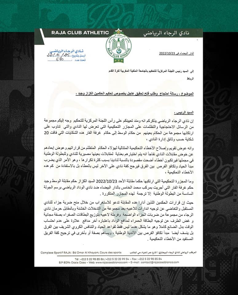 وأرفق الرجاء منشوره بالرسالة الرسمية المقدمة إلى الجامعة، والتي تم فيها توضيح جميع الحالات المثيرة للجدل، إلى جانب قرارات أخرى أضرت بالفريق في الديربي، وكذا الوقت بدل الضائع الذي اعتبره النادي غير كاف، موازاة مع مدة توقفات الشوط الثاني.