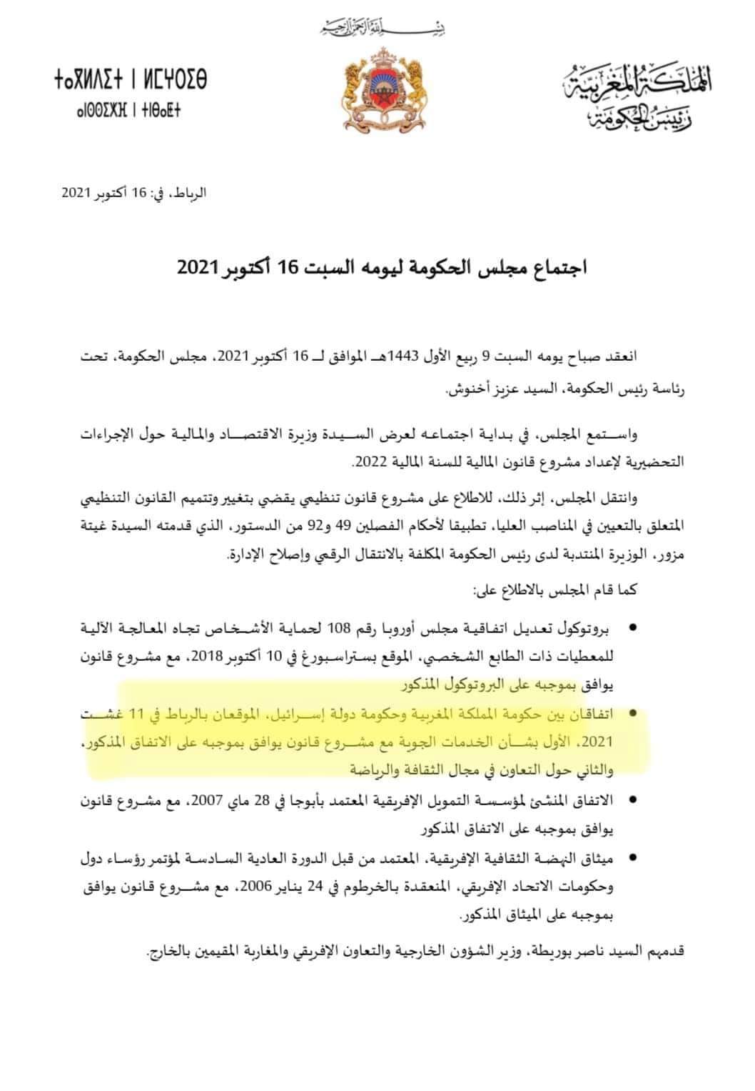 من جهة ثانية، اطلع المجلس على بروتوكول تعديل اتفاقية مجلس أوروبا رقم 108 لحماية الأشخاص تجاه المعالجة الآلية للمعطيات ذات الطابع الشخصي، الموقع بستراسبورغ في 10 أكتوبر 2018، مع مشروع قانون يوافق بموجبه على البروتوكول المذكور، بالإضافة لاتفاقين بين حكومة المملكة المغربية وحكومة دولة إسرائيل، الموقعان بالرباط في 11 غشت 2021، الأول بشأن الخدمات الجوية مع مشروع قانون يوافق بموجبه على الاتفاق المذكور، والثاني حول التعاون في مجال الثقافة والرياضة.