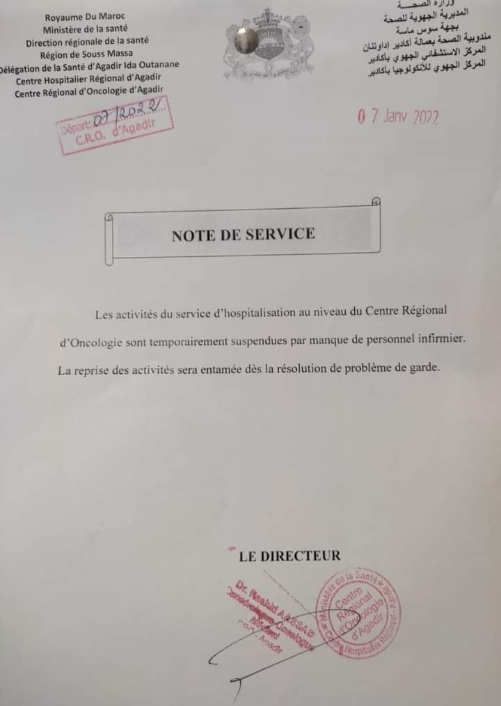 و عزت مذكرة مصلحة صادرة عن المركز، بأن سبب التوقف المؤقت راجع للنقص الحاصل في أطر التمريض.