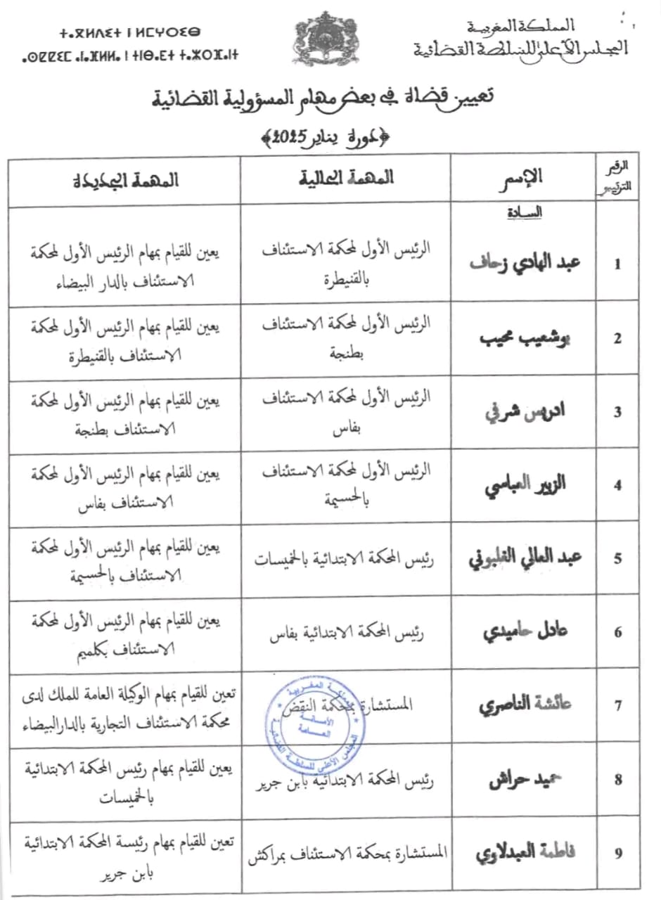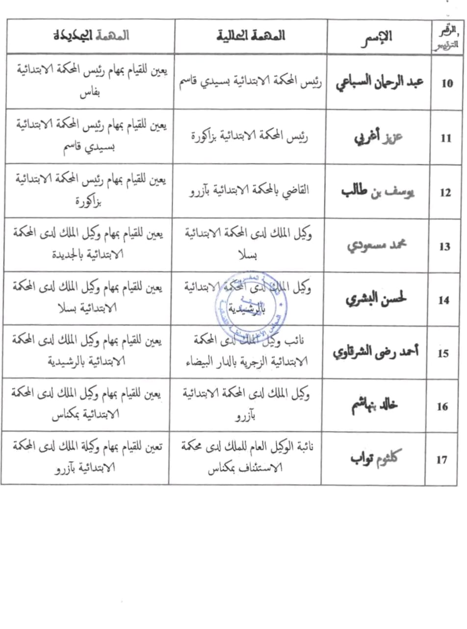 وقد توزعت التعيينات الجديدة بين ستة رؤساء أولين لمحاكم الاستئناف، ووكيلة عامة لدى محكمة استئناف تجارية، إضافة إلى خمسة رؤساء محاكم ابتدائية وخمسة وكلاء للملك بالمحاكم الابتدائية.